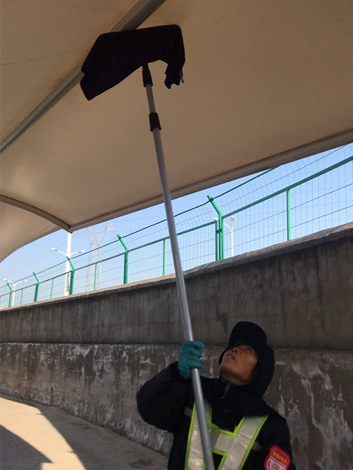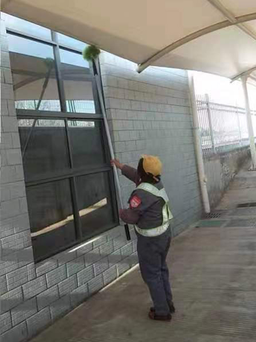 雨棚全長靠八百米左右,且因風吹雨打日曬的,看起來比較臟,起初在撣掃的時候,是想用長柄的玻璃刷進行擦拭,可以將上面的灰塵擦拭掉,可是在實踐中卻發(fā)現(xiàn)并不可行,收縮的伸縮桿較重,較粗的毛頭擦不到夾縫里,沾濕的毛巾擦在雨棚上,越擦越臟。因此,我們只能另改工具,用撣掃蜘蛛網(wǎng)的圓形撣子進行撣掃。果然,效果較好。撣子上的不銹鋼管事空心的也比較輕,撣球在撣掃時夾縫里都能撣掃掉,雖然不能雨棚上的污漬撣干凈,但能把上面得的一層灰都能給撣掉。在撣掃過程中,會有人來人往的訓練學員,我們會提醒他們,注意頭頂落灰,注意撣掃的桿子。以防桿子打到腳,導致摔倒。雨棚雖長,但我們一絲不茍的將之撣掃干凈,讓學員有更好的考訓環(huán)境,讓駕校更加干凈美麗。