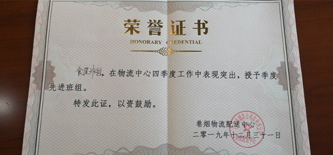 隨著2019年尾聲,迎來(lái)2020年的鐘聲,總結(jié)2019年的工作,高正集團(tuán)煙草項(xiàng)目部各部門員工都得到了甲方領(lǐng)導(dǎo)的認(rèn)可,最值得慶賀的是煙草物流食堂班組,因在物流中心四季度工作中表現(xiàn)突出,授予甲方領(lǐng)導(dǎo)頒發(fā)的季度先進(jìn)班組榮譽(yù)證書(shū)稱號(hào)。
