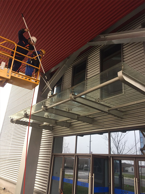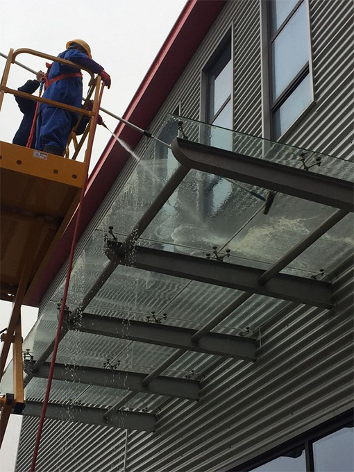 經過各部門領導簽字同意,項目組調整人員上班時間,明確分工:電工負責開登高車、一人上頂部沖洗、一人刮洗屋檐下方玻璃門、一人收放消火栓水管并處理地面積水、經理在下方進行登高車監(jiān)護。20日一早,專項人員穿戴好安全防護繩、安全帽,帶上勞動工具。由電工駕駛登高車輛,進行清理沖洗工作。由于還要沖洗屋檐后面的墻面,加上屋檐玻璃積灰多,高層作業(yè)沒有足夠大的空間,專項人員一邊沖洗,一邊用毛套加伸縮桿進行推洗,推完后再次沖洗,最后刮去屋檐上方積水。稍不留意毛套、刮刀就會掉下來。高層清洗工作比較耗費體力,一個屋檐清洗下來,專項人員手臂也酸了。稍作休息又繼續(xù)下一個屋檐的清洗。下午項目組又安排人員繼續(xù)清洗全廠其他15個小的屋檐。