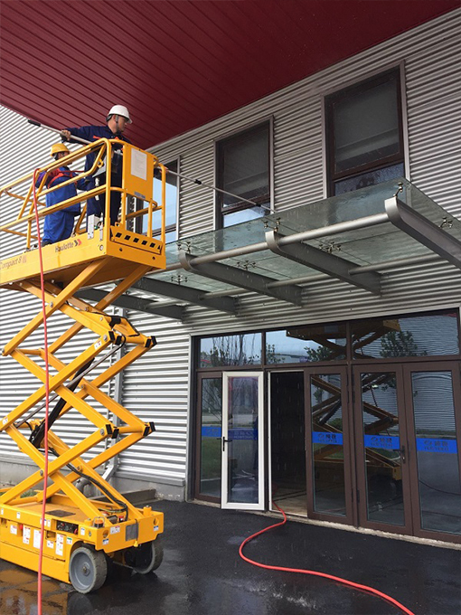 同方威視項目職能辦公區(qū)、5號車間前臺、6號車間前臺外面都有鋼結構屋檐。因屋檐淋不到雨,所以特別容易積灰塵。由于屋檐比較高,用梯子登高清洗,存在安全隱患。項目經理和甲方商量借用2號組合車間的升降式登高車,利用工人休息時間,進行高層作業(yè)--沖洗屋檐。