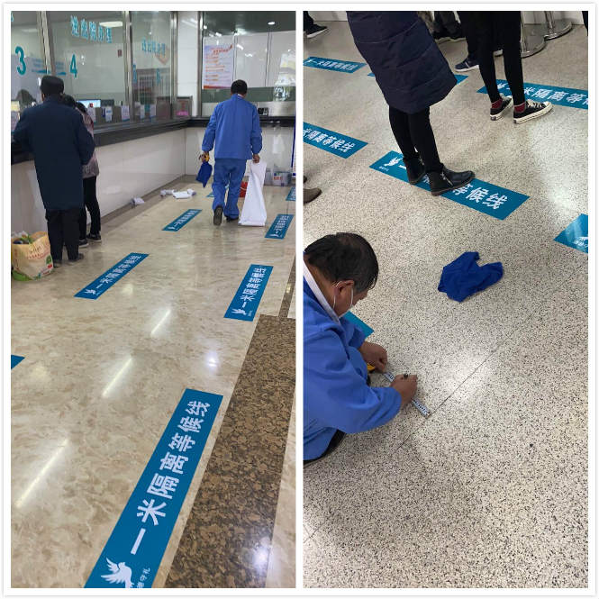 為了做好疫情防控工作,“好醫(yī)管”醫(yī)療事業(yè)部--啟東人民醫(yī)院項目部物業(yè)門診主管接到醫(yī)院宣傳科電話,要求我們在盡可能快的時間內,在各個掛號收費、取藥、檢查等窗口地面上張貼一米距離間隔地標。