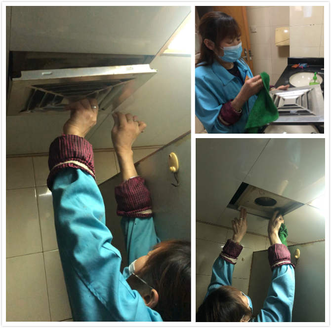首先,需要小心的拔下排氣扇,松開前后螺絲,輕輕地取下排氣扇的后蓋,拉出排氣扇的連接器,然后將過濾器和后蓋一起拆下來。接下來用洗滌劑和水調(diào)配到適當?shù)臐舛,由于大樓一樓、三樓和五樓衛(wèi)生間,是男士衛(wèi)生間,煙漬、頑漬比較厚重,則用熱水和洗滌劑將過濾器和后蓋放入容器中,洗滌10-15分鐘,最后沖洗干凈后將過濾器和后蓋重新安裝到原始的位置。由于項目部保潔主管一直非常注重衛(wèi)生的細節(jié)方面的培訓,通過了半天時間的清洗工作,十多扇排氣扇都被阿姨洗得光亮如新?粗簧壬惹鍧嵧戤叺呐艢馍,由衷感嘆保潔阿姨不僅要把平日里的日常工作做好,而且還要很熟知相關(guān)技術(shù)、技巧。真是了不起!