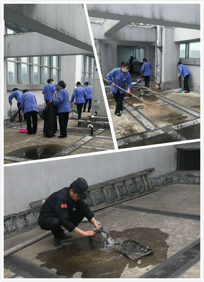 雨季即將到來,高正集團人壽項目辦公樓頂上有風(fēng)機設(shè)備和機房等重要設(shè)施。為了防止頂樓的雜物在雨水的沖刷下堵塞下水道,造成不必要的損失,物業(yè)組織員工集體打掃樓頂。