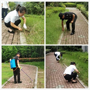 針對(duì)這種情況,高正集團(tuán)項(xiàng)目部的丁主管帶領(lǐng)物業(yè)人員一起鋤草,噴灑殺蟲(chóng)劑,充分發(fā)揮我們物業(yè)人不怕苦、不怕累的精神。保潔阿姨和保安分工明確,配合默契,保潔阿姨有的用手拔,有的用小鏟刀,有的負(fù)責(zé)清理現(xiàn)場(chǎng);保安噴灑藥水,在大家齊心協(xié)力下,整個(gè)綠化帶煥然一新。