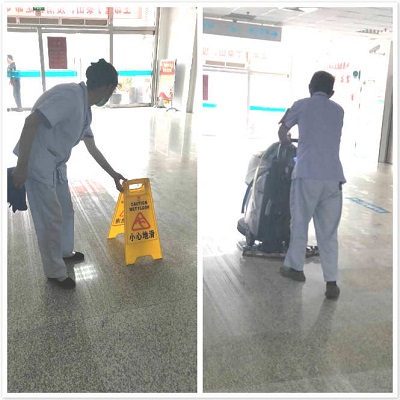 通過一系列的提前準(zhǔn)備工作,醫(yī)院地面就看上去又干凈又清爽,消除了黃梅季節(jié)地面濕滑,行人摔倒的隱患。