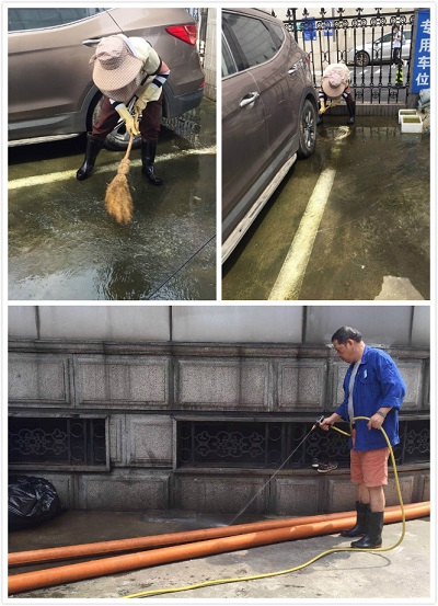 首先安排保潔部負責清理青苔,先噴灑專業(yè)的青苔去除劑,等青苔溶解后再清掃。工程部則配合使用水槍沖洗路面,并在相應的路面上放好警示牌,提醒行人注意路面濕滑?紤]到窨井排出的水多少都有點異味,天氣炎熱,容易滋生蚊蠅害蟲。所以項目部安排保潔每天對排水口進行消毒,減少異味,同時對容易積水的路面,經(jīng)常清掃,以免再次滋生青苔。