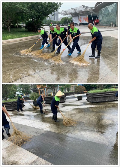 除此之外,由于常州奧體中心室外廣場和停車場的面積體量巨大,室外場地存在大量的積水坑,奧體中心項(xiàng)目部的保潔師傅、阿姨們在完成原本劃分工作任務(wù)之余,大雨一過便開始相互組織起來到室外場地一遍一遍地把積水推掉,并把大雨過后路邊、廣場邊上花壇中涌出來的淤泥一一清理干凈,保證現(xiàn)場不會(huì)出現(xiàn)大型積水坑,不影響奧體中心客戶的到訪和市民的每日健身。