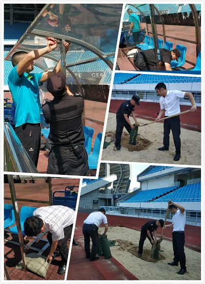 經(jīng)巡查發(fā)現(xiàn),奧體中心田徑場跑道周邊有一些遮陽棚,由于風(fēng)大可能會發(fā)生后翻的情況,造成物品損壞,如果壓到人,那就更危險了,所以需要提前加固,杜絕安全隱患。之前防汛用的沙袋還有剩余在項目上,現(xiàn)在正好可以派上用場了。于是,保安主管帶著隊長和幾個保安,把防汛沙袋里灌滿沙子,壓在座位下面的欄桿上,壓實后上面欄桿處又用鐵絲綁牢加固。