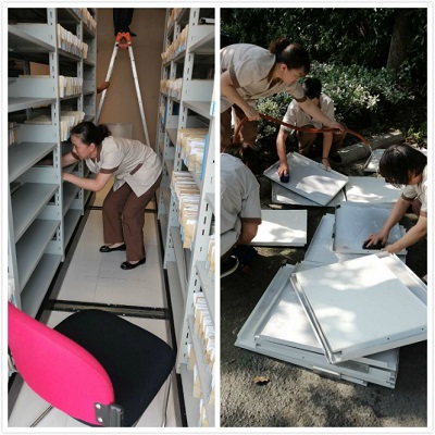8月7日依舊高溫天氣,在戶外清掃保潔,光是站著不動(dòng)都會(huì)出一身汗,就在這時(shí)我們接到甲方通知要幫他們把檔案室清理出來。檔案室里密密麻麻的堆滿了資料,網(wǎng)格化的柜子給清理帶來了麻煩,爬上爬下也不方便,于是我們就把所有鐵皮柜子拆下來用拖車拖到洗車的地方?jīng)_洗。保潔員們頂著大太陽一塊一塊的清洗,長年累月的積灰要用清潔劑才能去除,工作量比較大。