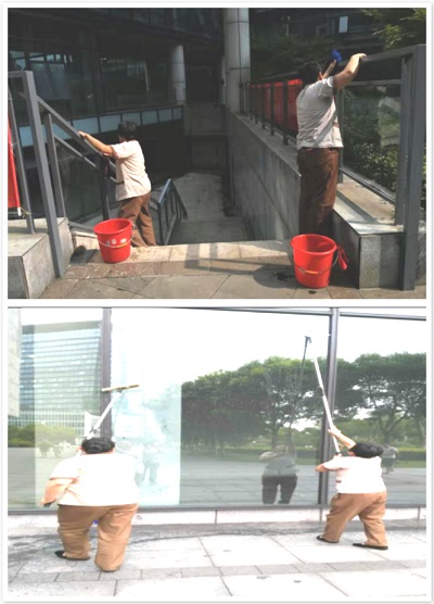 8月10日下午,烈日炎炎,她們來(lái)到了大廳進(jìn)行外場(chǎng)玻璃清潔工作,F(xiàn)場(chǎng)保潔員們動(dòng)作熟練麻利,先用玻璃清洗劑噴灑,然后用毛巾擦拭,伸手夠不到的玻璃,便用伸縮玻璃刷擦拭,她們一遍遍重復(fù)著手里的動(dòng)作,實(shí)在累了,就換個(gè)姿勢(shì)進(jìn)行。連續(xù)2個(gè)多小時(shí)的清洗工作,汗水濕透了她們的衣裳。在所有保潔員的齊心合力下,大廳恢復(fù)了明亮干凈。
