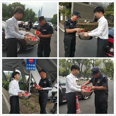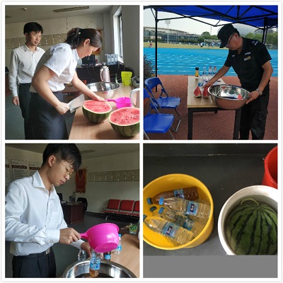 為了員工們的身體健康,奧體中心項(xiàng)目購(gòu)買了血壓計(jì),每天為上崗人員測(cè)量血壓,并在場(chǎng)館幾個(gè)重要位置放置了龍虎人丹、速效救心丸等急救藥品。在召開(kāi)班前、班后會(huì)的時(shí)候,項(xiàng)目經(jīng)理、主管都會(huì)詢問(wèn)、檢查員工身體狀況,囑咐大家這段時(shí)間一定要注意防暑降溫,身體有不適的情況及時(shí)上報(bào),去臨近的空調(diào)室內(nèi)休息。另外,項(xiàng)目還采購(gòu)了酸梅汁、果汁等飲品,每天早上物業(yè)辦公室管理員就燒開(kāi)水沖好飲品,放涼后灌入瓶子里,浸在冰水中,每天上午一次、下午一次送到崗位上給員工飲用。買的西瓜也提前放在冰水里浸泡,希望能給員工們帶去絲絲涼意,消暑降溫。