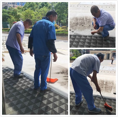 于是,主管連忙打電話給醫(yī)院總務(wù)科說(shuō)明情況,他們立即派了兩個(gè)木匠先把損壞的玻璃門敲下來(lái)。由于敲的時(shí)候碎小的玻璃灑落在門外面的防滑墊子上,有一定的安全隱患,所以主管馬上安排項(xiàng)目上的機(jī)動(dòng)工友開始清理碎玻璃片,并將之前堆積的灰塵全部清理干凈。他們先把防滑墊翻過(guò)來(lái),把能拍掉的碎屑先拍掉,再用手把剩余的拍不出來(lái)的碎玻璃一點(diǎn)一點(diǎn)撿起來(lái),撿的差不多了,再把防滑墊放回原地,并且將防滑墊四邊踩平,最后,三個(gè)師傅再把清理出來(lái)的垃圾全部清理掉。