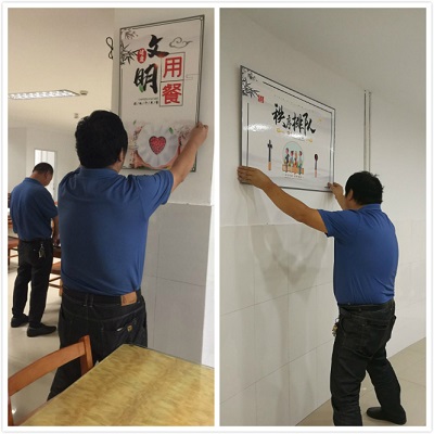 宣傳畫(huà)張貼好后,瞬間覺(jué)得食堂變得多姿多彩了,不再是單調(diào)的白。項(xiàng)目部做事的高效與時(shí)效性給甲方領(lǐng)導(dǎo)留下了深刻的印象,得到了領(lǐng)導(dǎo)的贊賞。