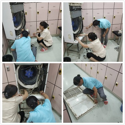 雖然空調(diào)是放在室內(nèi)的,但里面的灰塵可一點都不少,在更衣室工作的保安也主動幫忙。她們先把擋風(fēng)板輕輕拆下來,把濾網(wǎng)全部拿到水龍頭下面,一邊用刷子刷,一邊沖洗。雖然隔段時間就打開清理,但里面還是很多臟東西。她們找來細(xì)鉛絲、板刷、抹布等工具,慢慢伸進(jìn)去,從里往外一點一點把垃圾清理出來。真是看不出來,里面居然這么臟,清出來的垃圾足足有一垃圾袋。清完再用刷子刷,抹布擦,兩人蹲在地上腿都麻了,雖然不是力氣活,但也熱得出了一身汗。最后再把濾網(wǎng)、擋風(fēng)板全部裝上,重新啟動空調(diào),吹著涼涼的風(fēng),頓時感覺空氣好像也清新了不少。