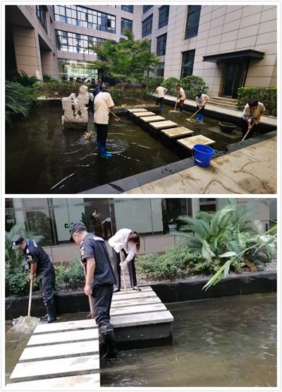 將所有的收尾工作做完后把干凈的水引入池中,把小金魚(yú)也放回他們的小家。甲方領(lǐng)導(dǎo)看到大家努力的成果很滿意,說(shuō)物業(yè)辦事太高效率了。感謝辛勤付出的物業(yè)人,也感謝領(lǐng)導(dǎo)對(duì)物業(yè)工作的認(rèn)可!